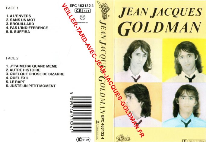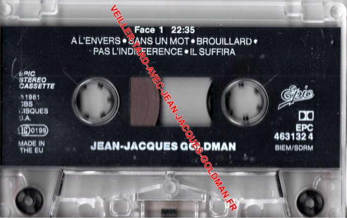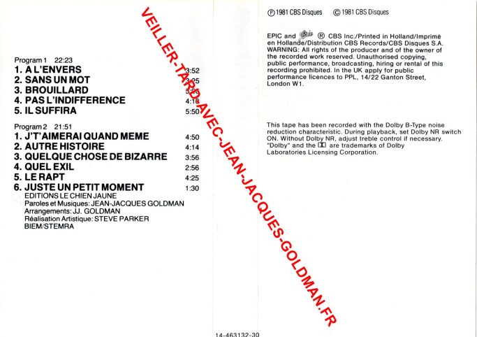 VERSO / PROGRAM 1 - 22:23 - 1 - A L'ENVERS - 3:52 + 2 - SANS UN MOT - 3:25 + 3 - BROUILLARD - 5:06 + 4 - PAS L'INDIFFERENCE 4:10 + 5 - IL SUFFIRA 5:50 - PROGRAM 2 - 21:51 - 1 - J'T'AIMERAI QUAND MEME - 4:50 + 2 - AUTRE HISTOIRE 4:14 + 3 - QUELQUE CHOSE DE BIZARRE - 3:56 + 4 - QUEL EXIL - 2:56 + 5 - LE RAPT - 4:25 + 6 - JUSTE UN PETIT MOMENT - 1:30 - EDITIONS LE CHIEN JAUNE - PAROLES ET MUSIQUES : JEAN-JACQUES GOLDMAN - ARRANGEMENTS : J.J. GOLDMAN - REALISATION ARTISTIQUE : STEVE PARKER - BIEM / STEMRA / P 1981 CBS DISQUES - C 1981 CBS DISQUES - EPIC & EPIC R CBS INC. / PRINTED IN HOLLAND - IMPRIME EN HOLLANDE - DISTRIBUTION CBS RECORDS - CBS DISQUES S.A. - WARNING : ALL RIGHTS OF THE PRODUCER ND THE OWNER OF THE OF THE RECORDED WORK RESERVED. UNAUTHORISED COPYING, PUBLIC PERFORMANCE, BROADCASTING, HIRING OR RENTAL OF THIS RECORDING PROHIBITED. IN THE UK, APPLY FOR PUBLIC PERFORMANCE LICENCES TO PPL, 14/22 GANTON STREET, LONDON W1. - THIS TAPE HAS BEEN RECORDED WITH THE DOLBY B-TYPE NOISE REDUCTION CHARACTERISTIC. DURING PLAYBACK, SET DOLBY NR SWITCH ON , WITHOUT DOLBY NR, ADJUST TREBLE CONTROL IF NECESSARY - DOLBY & LOGO ARE TRADEMARKS OF DOLBY LABORATORIES CORPORATION.