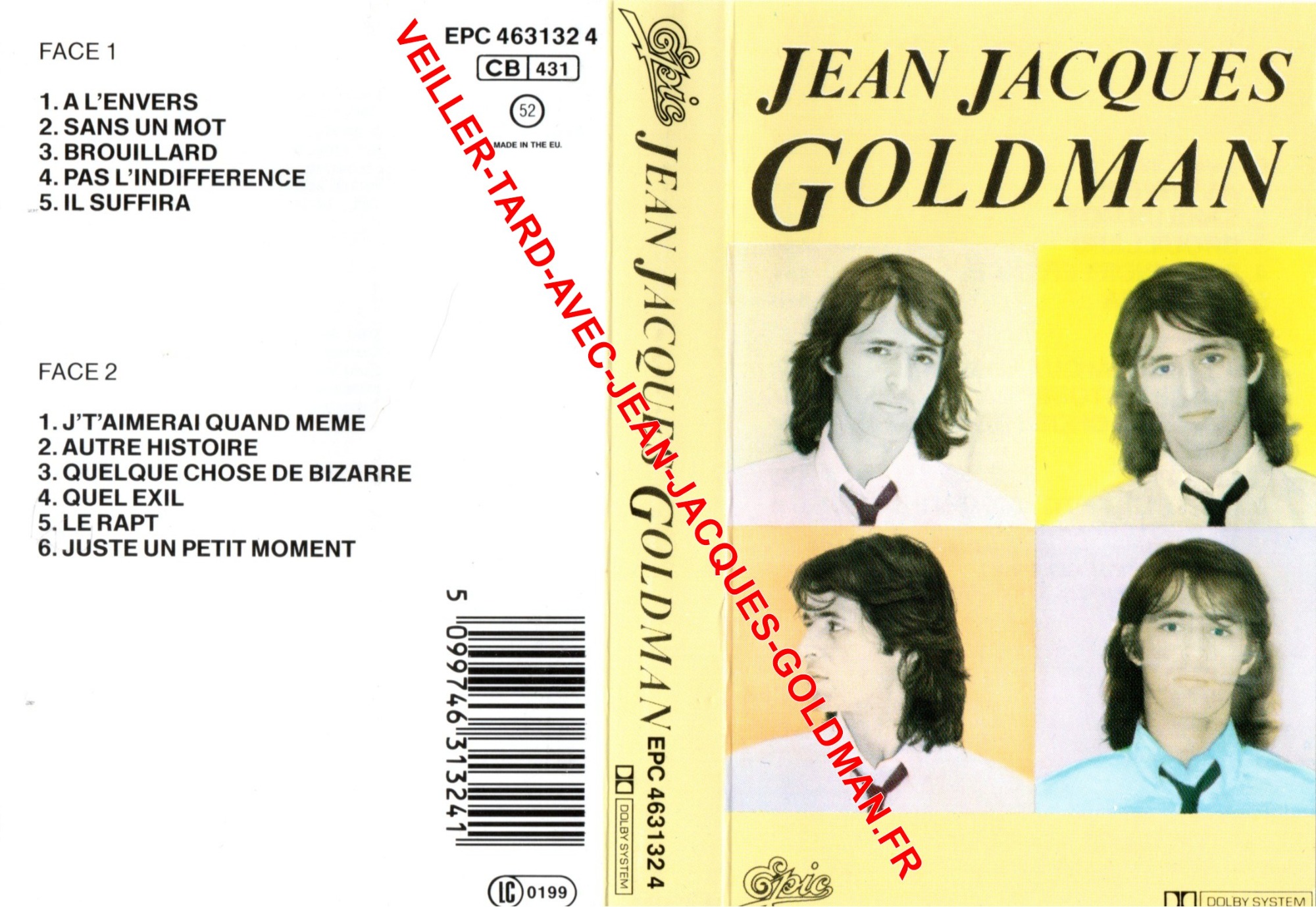 RECTO / FACE 1 - A L'ENVERS - SANS UN MOT - BROUILLARD - PAS L'INDIFFERENCE - IL SUFFIRA / FACE 2 - J'T'AIMERAI QUAND MEME - AUTRE HISTOIRE - QUELQUE CHOSE DE BIZARRE - QUEL EXIL - LE RAPT - JUSTE UN PETIT MOMENT /EPC 463132 4 - CB 431 - 52 - MADE IN THE EU - CODE BARRE 5 099746 313241 - LC 0199 / EPIC JEAN JACQUES GOLDMAN EPC 463132 4 DOLBY SYSTEM / JEAN JACQUES GOLDMAN - POCHETTE 4 PHOTOS - EPIC - DOLBY SYSTEM