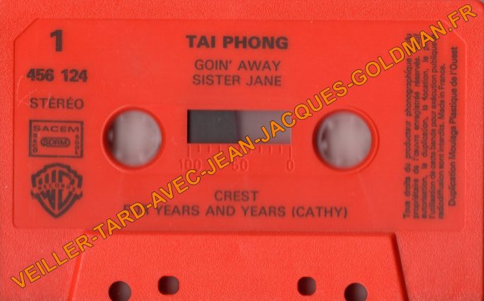 FACE 1 - 456 124 - STEREO - SACEM - SACD - SDRM - SGDL - WB RECORDS / TAÏ PHONG - 1) GOIN'AWAY - 2) SISTER JANE - 3 ) CREST - 4) FOR YEARS AND YEARS (CATHY) - TOUS DROITS DU PRODUCTEUR PHONOGRAPHIQUE ET DU PROPRIETAIRE DE L'OEUVRE ENREGISTREE RESERVES. SAUF AUTORISATION, LA DUPLICATION. LA LOCATION, LE PRET, L'UTILISATIION DE CETTE BANDE POUR EXCECUTION PUBLIQUEET RADIODIFFUSION SONT INTERDITS. MADE IN FRANCE. DUPLICATION MOULAGE PLASTIQUE DE L'OUEST