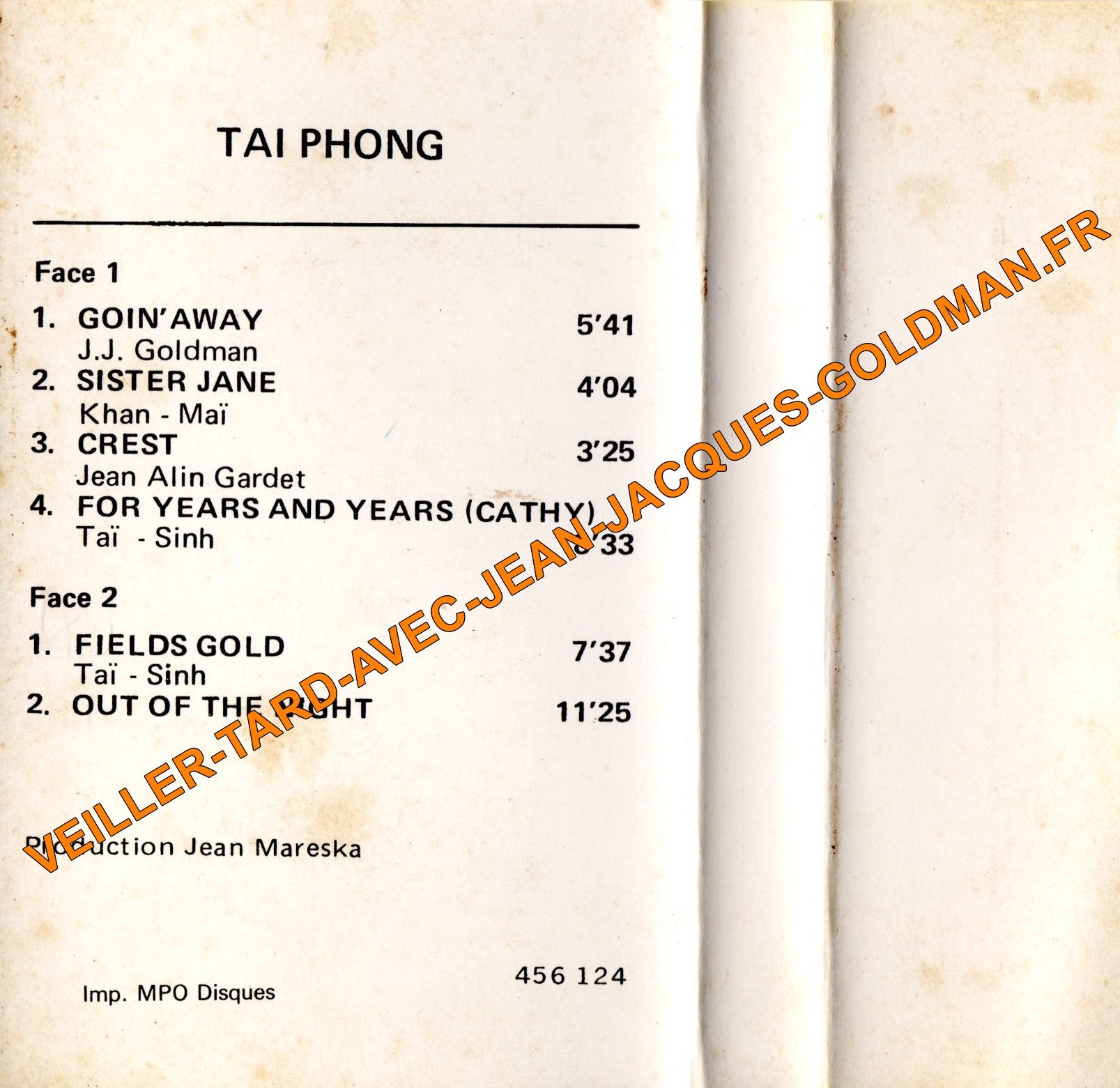 VERSO / ECRITURE NOIRE - TAI PHONG - FACE 1 / 1 - GOIN'AWAY - J. J. GOLDMAN - 5'41 + 2 - SISTER JANE KHAN - MAÏ - 4'04 + 3 - CREST JEAN ALIN GARDET - 3'25 + 4 - FOR YEARS AND YAEARS (CATHY) - TAÏ - SINH - 8'33 / FACE 2 / 1 - FIELDS GOLD - TAÏ - SINH - 7'37 + 2 - OUT OF THE NIGHT - 11'25 / PRODUCTION JEAN MARESKA / IMP. MPO DISQUES / 456124