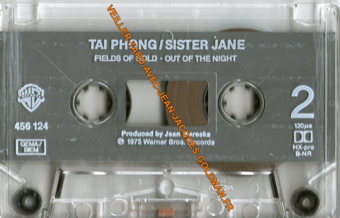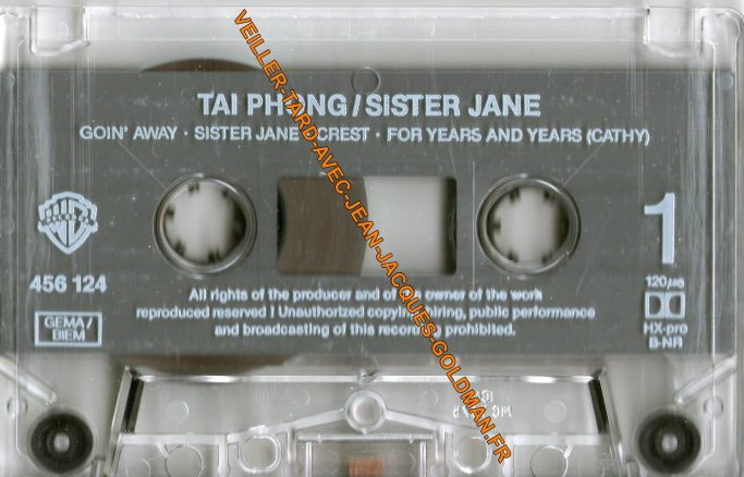VERSO / ECRITURE NOIRE - TAI PHONG - FACE 1 / 1 - GOIN'AWAY - J. J. GOLDMAN - 5'41 + 2 - SISTER JANE KHAN - MAÏ - 4'04 + 3 - CREST JEAN ALIN GARDET - 3'25 + 4 - FOR YEARS AND YAEARS (CATHY) - TAÏ - SINH - 8'33 / FACE 2 / 1 - FIELDS GOLD - TAÏ - SINH - 7'37 + 2 - OUT OF THE NIGHT - 11'25 / PRODUCTION JEAN MARESKA / 456124