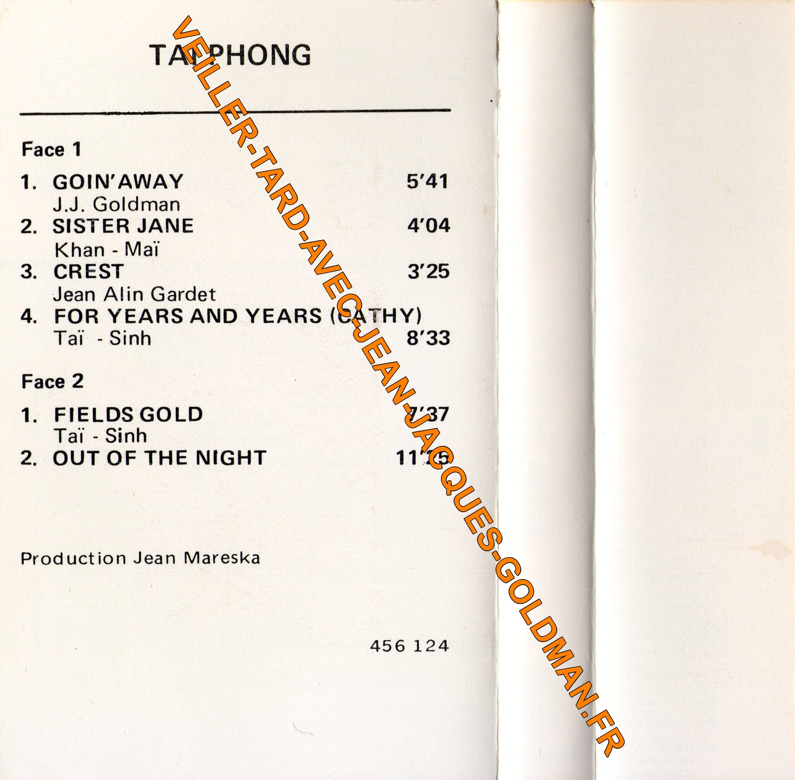 VERSO / ECRITURE NOIRE - TAI PHONG - FACE 1 / 1 - GOIN'AWAY - J. J. GOLDMAN - 5'41 + 2 - SISTER JANE KHAN - MAÏ - 4'04 + 3 - CREST JEAN ALIN GARDET - 3'25 + 4 - FOR YEARS AND YAEARS (CATHY) - TAÏ - SINH - 8'33 / FACE 2 / 1 - FIELDS GOLD - TAÏ - SINH - 7'37 + 2 - OUT OF THE NIGHT - 11'25 / PRODUCTION JEAN MARESKA / 456124