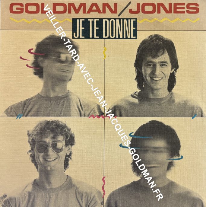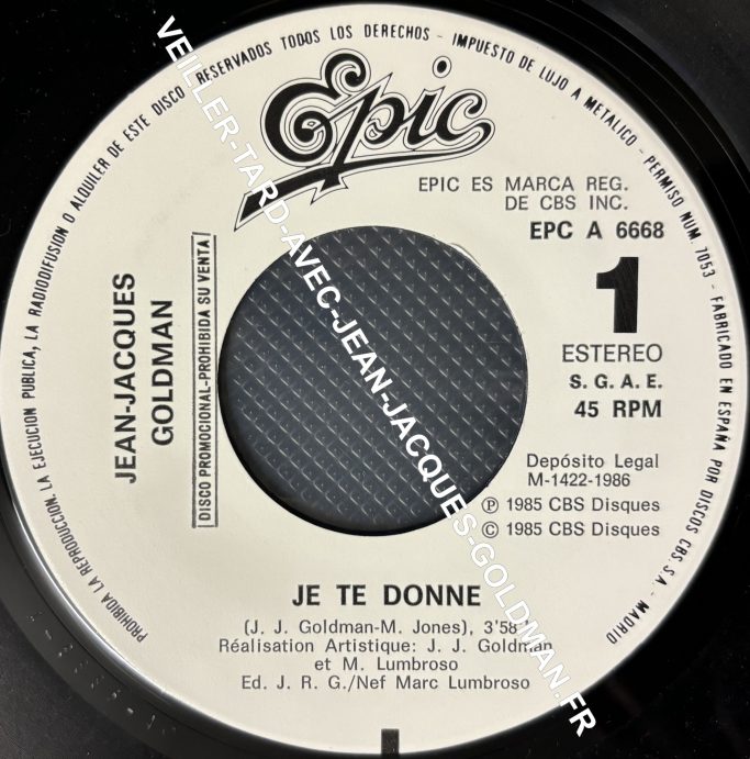 SP 2 TITRES : JEAN - JACQUES GOLDMAN - JE TE DONNE (J. J. GOLDMAN / M. JONES) 3:58 - CONFIDENTIEL (J. J. GOLDMAN) 2:35 - REALISATION ARTISTIQUE : J. J. GOLDMAN ET M. LUMBROSO - EPIC EPC A-6668 (SG) ESTEREO - PAROLE JE TE DONNE - TODOS LOS DERECHOS DEL PRODUCTOR Y DEL PROPIETARIO DE LA OBRA GRABADA ESTAN RESERVADOS. ESTAN PROHIBIDAS LA COPIA, INTERPRETACION PUBLICA, RADIODIFUSION, AQUILER O PRESTAMO DE ESTA GRABACION SIN AUTORIZACION. EPIC Y EPIC SON MARCAS REGISTRADAS DE CBS INC. FABRICADO EN ESPANA. ESTE DISCO ESTEREO PUEDE SER TAMBIEN REPRODUCIDO EN UN TOCADISCOS MONOAURAL - C 1985 CBS DISQUES - P 1985 CBS DISQUES - EPIC ES LA MARCA REGISTRADA DE CBS INC. DISCOS CBS, S. A. / PASEO DE LA CASTELIANA, 93 / 28046 - MADRID - OFFSET ALG, S. A. / SAN RAIMUNDO , 31 / 28039 - MADRID