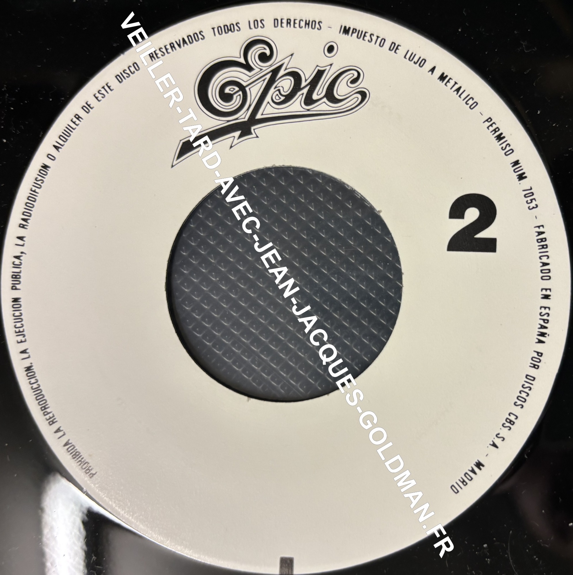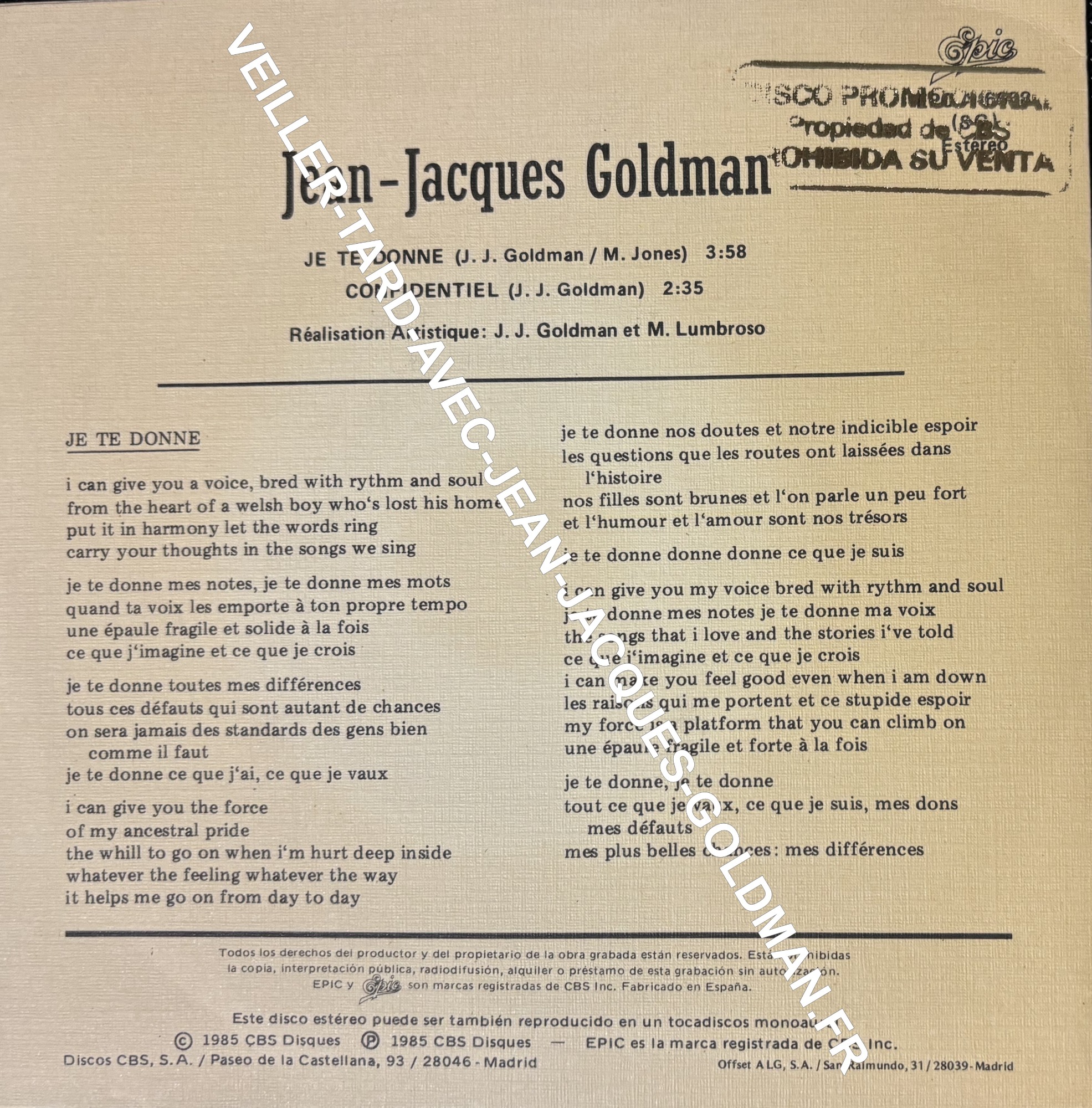 SP 2 TITRES : JEAN - JACQUES GOLDMAN - JE TE DONNE (J. J. GOLDMAN / M. JONES) 3:58 - CONFIDENTIEL (J. J. GOLDMAN) 2:35 - REALISATION ARTISTIQUE : J. J. GOLDMAN ET M. LUMBROSO - EPIC EPC A-6668 (SG) ESTEREO - PAROLE JE TE DONNE - TODOS LOS DERECHOS DEL PRODUCTOR Y DEL PROPIETARIO DE LA OBRA GRABADA ESTAN RESERVADOS. ESTAN PROHIBIDAS LA COPIA, INTERPRETACION PUBLICA, RADIODIFUSION, AQUILER O PRESTAMO DE ESTA GRABACION SIN AUTORIZACION. EPIC Y EPIC SON MARCAS REGISTRADAS DE CBS INC. FABRICADO EN ESPANA. ESTE DISCO ESTEREO PUEDE SER TAMBIEN REPRODUCIDO EN UN TOCADISCOS MONOAURAL - C 1985 CBS DISQUES - P 1985 CBS DISQUES - EPIC ES LA MARCA REGISTRADA DE CBS INC. DISCOS CBS, S. A. / PASEO DE LA CASTELIANA, 93 / 28046 - MADRID - OFFSET ALG, S. A. / SAN RAIMUNDO , 31 / 28039 - MADRID