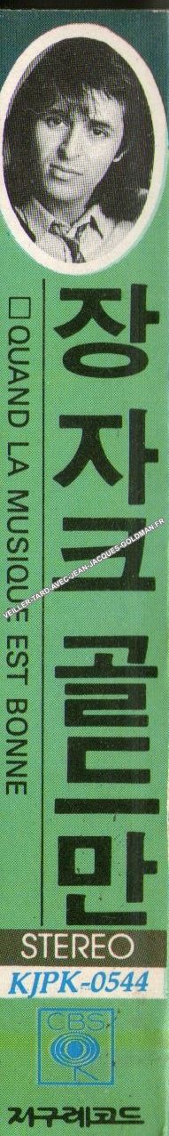 SIDE B - CBS - LOGO DOLBY STEREO / JEAN-JACQUES GOLDMAN - QUAND LA MUSIQUE EST BONNE - 1 - QUAND LA MUSIQUE EST BONNE - 2 - JE NE VOUS PARLERAI PAS D'ELLE - 3 - ETRE LE PREMIER - 4 - SI TU M'EMMENES - 5 - MINORITAIRE - 6 - QUAND LA BOUTEILLE EST VIDE - 87-1041 - (87. 9. 14) (87.10.15) - MANUFACTURED BY JIGURECORD CORPORATION - REGISTRD NO. 1 TO THE MINISTRY OF CULTURE & INFORMATION PASSED CENSORSHIP BY K.E.C.P.P. PRINTED IN KOREA / B - KJPK-054