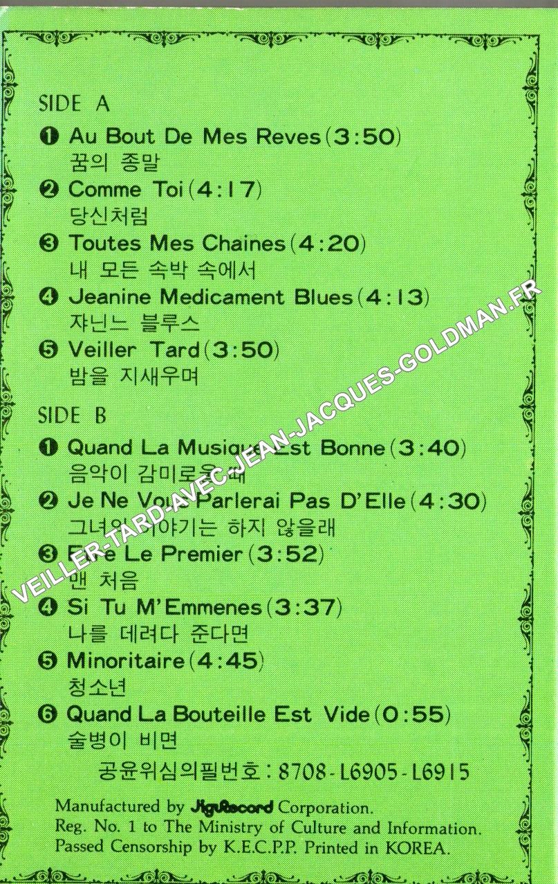 VERSO / SIDE A - 1 AU BOUT DE MES REVES (3:50) - 2 COMME TOI (4:17) - 3 TOUTES MES CHAINES (4:20) - 4 - JEANINE MEDICAMENT BLUES (4:13) - 5 - VEILLER TARD (3:50) / SIDE B - 1 QUAND LA MUSIQUE EST BONNE (3:40) - 2 JE NE VOUS PARLERAI PAS D'ELLE (4:30) - 3 ETRE LE PREMIER (3:52) - 4 SI TU M'EMMENES (3:37) - 5 MINORITAIRE (4:45) - 6 QUAND LA BOUTEILLE EST VIDE (0:55) - 8708 - L6905 - L6915 MANUFACTURED BY JIGURECORD CORPORATION - REG. NO. 1 TO THE MINISTRY OF CULTURE AND INFORMATION. PASSED CENSORSHIP BY K.E.C.P.P. PRINTED BY KOREA