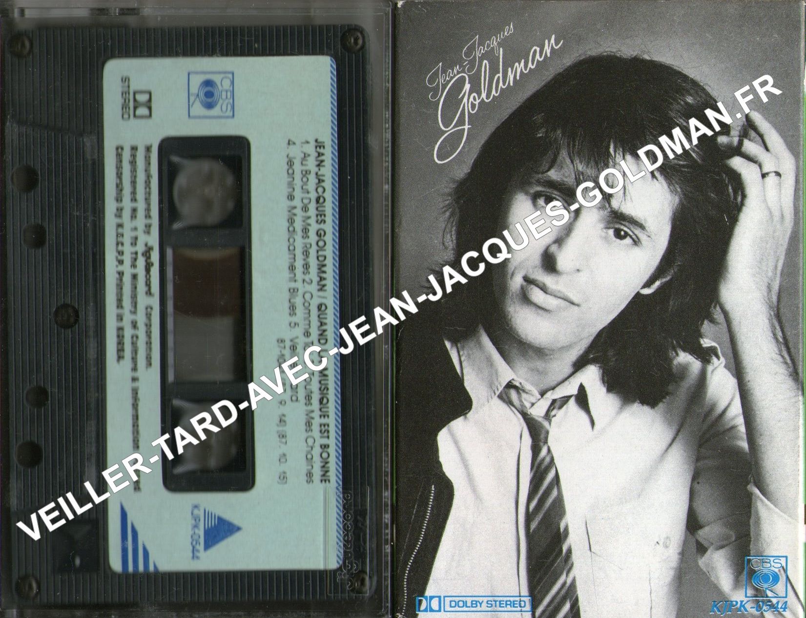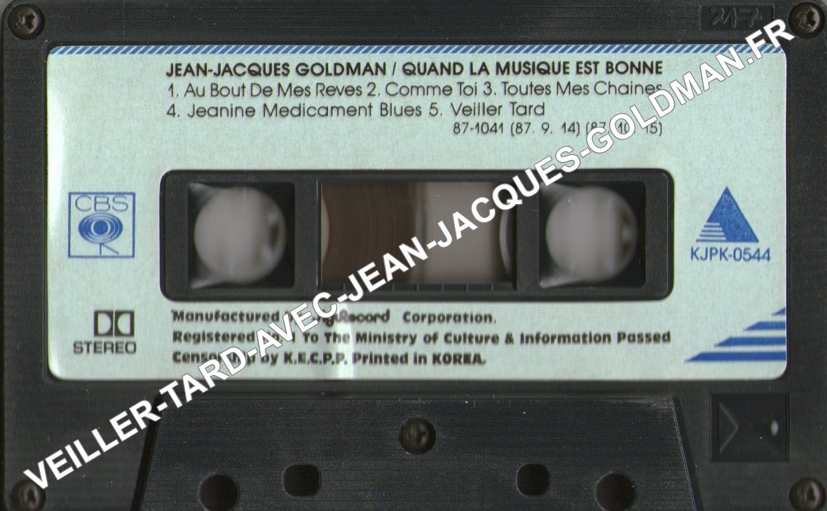 SIDE A - CBS - LOGO DOLBY STEREO / JEAN-JACQUES GOLDMAN - QUAND LA MUSIQUE EST BONNE - 1 - AU BOUT DE MES REVES - 2 - COMME TOI - 3 - TOUTES MES CHAINES - 4 - JEANINE MEDICAMENT BLUES - 5 - VEILLER TARD - 87-1041 - (87. 9. 14) (87.10.15) - MANUFACTURED BY JIGURECORD CORPORATION - REGISTRD NO. 1 TO THE MINISTRY OF CULTURE & INFORMATION PASSED CENSORSHIP BY K.E.C.P.P. PRINTED IN KOREA / A - KJPK-0544