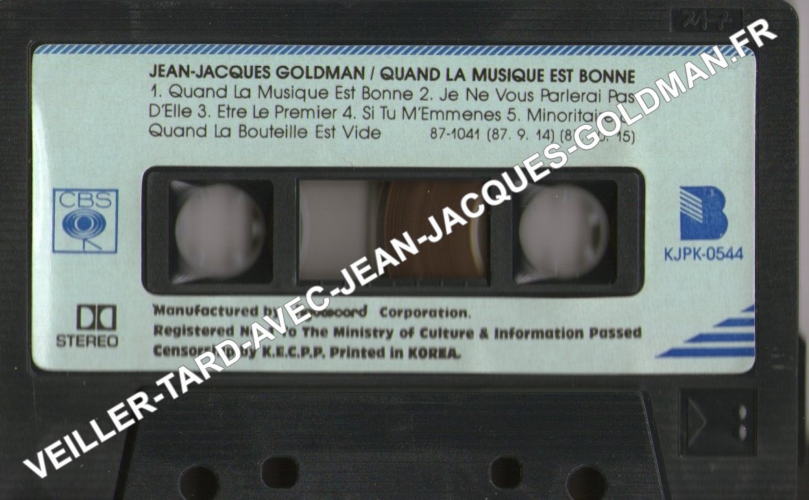 SIDE B - CBS - LOGO DOLBY STEREO / JEAN-JACQUES GOLDMAN - QUAND LA MUSIQUE EST BONNE - 1 - QUAND LA MUSIQUE EST BONNE - 2 - JE NE VOUS PARLERAI PAS D'ELLE - 3 - ETRE LE PREMIER - 4 - SI TU M'EMMENES - 5 - MINORITAIRE - 6 - QUAND LA BOUTEILLE EST VIDE - 87-1041 - (87. 9. 14) (87.10.15) - MANUFACTURED BY JIGURECORD CORPORATION - REGISTRD NO. 1 TO THE MINISTRY OF CULTURE & INFORMATION PASSED CENSORSHIP BY K.E.C.P.P. PRINTED IN KOREA / B - KJPK-054
