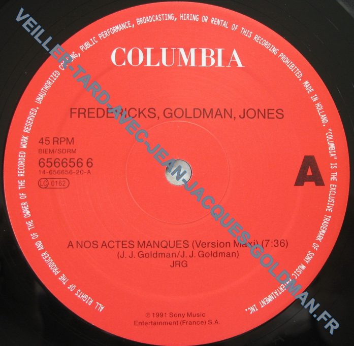 FACE A : 45 RPM - BIEM / SDRM - 656656 6 14-656656-20- A - LC 0162 / COLUMBIA - FREDERICKS, GOLDMAN, JONES - A NOS ACTES MANQUES - VERSION MAXI - (7:36) (J.J. GOLDMAN / J.J. GOLDMAN) JRG - P 1991 SONY MUSIC ENTERTAINMENT (FRANCE) S.A. / A