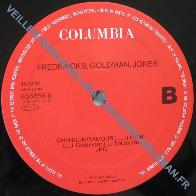 FACE 2 : 45 RPM - BIEM / SDRM - 656656 6 14-656656-20- B - LC 0162 / COLUMBIA - FREDERICKS, GOLDMAN, JONES - CHANSON D'AMOUR(...!) (4:06) (J.J. GOLDMAN / J.J. GOLDMAN) JRG - P 1991 SONY MUSIC ENTERTAINMENT (FRANCE) S.A. / B