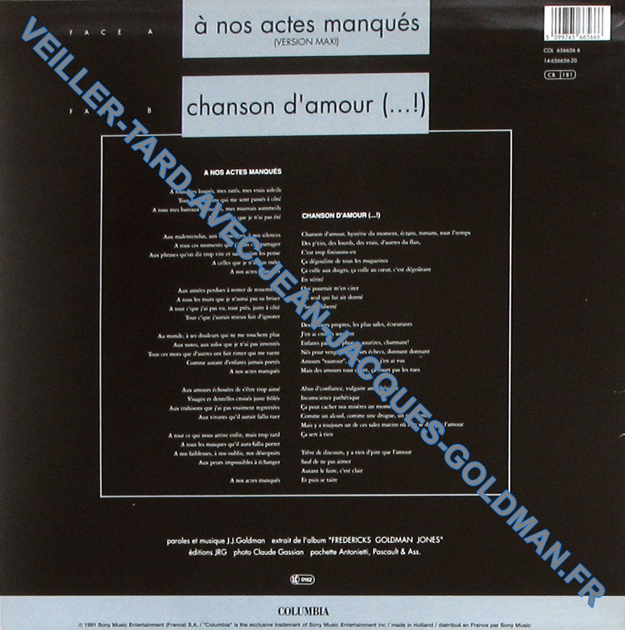 POCHETTE VERSO : FACE A - A NOS ACTES MANQUES - (VERSION MAXI) / FACE B - CHANSON D'AMOUR(...!) / A NOS ACTES MANQUES - PAROLES / CHANSON D'AMOUR(...!) PAROLES / PAROLES ET MUSIQUE J.J.GOLDMAN - EXTRAIT DE L'ALBUM "FREDERICKS GOLDMAN JONES" - EDITIONS JRG - PHOTO CLAUDE GASSIAN - POCHETTE ANTONIETTI, PASCAULT & ASS. / LC 0162 / COLUMBIA - C 1991 SONY MUSIC ENTERTAINMENT (FRANCE) S.A. / "COLUMBIA" IS THE EXCLUSIVE TRADEMARK OF SONY ENTERTAINMENT INC / MADE IN HOLLAND / DISTRIBUE EN FRANCE PAR SONY MUSIC / CODE BARRE 5 099765 65666 - COL 656656 6 - 14-656656-20 CB 181
