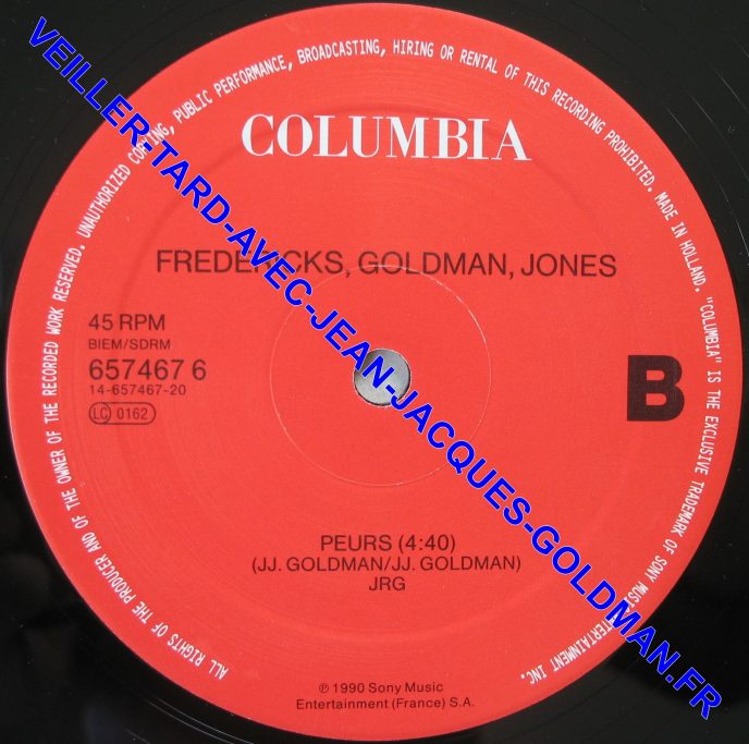 FACE 2 : 45 RPM - BIEM / SDRM - 657467 6 14-657467-20 - LC 0162 / COLUMBIA - FREDERICKS, GOLDMAN, JONES - PEURS - (4:40) (J.J. GOLDMAN / J.J. GOLDMAN) JRG - P 1990 SONY MUSIC ENTERTAINMENT (FRANCE) S.A. / B