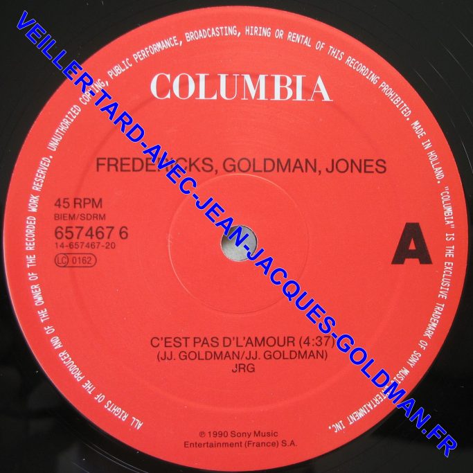 FACE A : 45 RPM - BIEM / SDRM - 657467 6 14-657467-20- LC 0162 / COLUMBIA - FREDERICKS, GOLDMAN, JONES - C'EST PAS D'L'AMOUR - (4:37) (J.J. GOLDMAN / J.J. GOLDMAN) JRG - P 1990 SONY MUSIC ENTERTAINMENT (FRANCE) S.A. / A