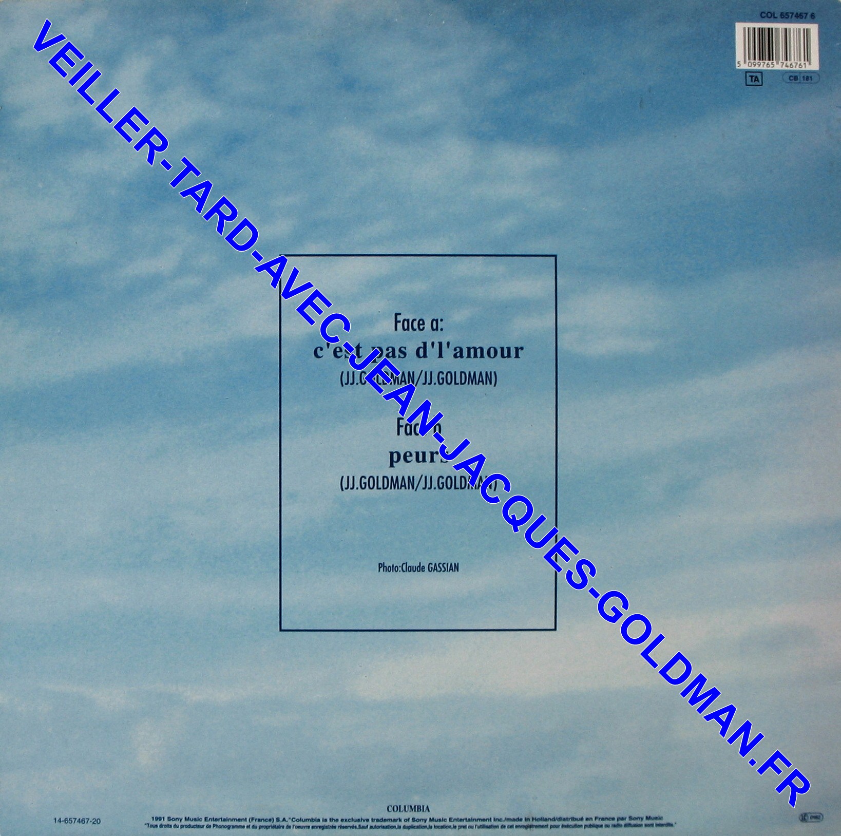 POCHETTE VERSO : COL 657467 6 - CODE BARRE 5 099765 746761 TA CB 181 / FACE A : C'EST PAS D' L'AMOUR (J.J. GOLDMAN / J.J. GOLDMAN) +FACE B : PEURS (J.J. GOLDMAN / J.J. GOLDMAN) - PHOTO : CLAUDE GASSIAN / 14-657467-20/ COLUMBIA - 1991 SONY MUSIC ENTERTAINMENT (FRANCE) S.A. / "COLUMBIA" IS THE EXCLUSIVE TRADEMARK OF SONY MUSIC ENTERTAINMENT INC. / MADE IN HOLLAND / DIS TRIBUE EN FRANCE PAR SONY MUSIC. / "TOUS DROITS DU PRODUCTEUR DE PHONOGRAMME ET DU PROPRIETAIRE DE L'OEUVRE ENREGISTREE RESERVES. SAUF AUTORISATION, LA DUPLICATION, LA LOCATION, LE PRET OU L'UTILISATION DE CET ENREGISTREMENT POUR EXECUTION PUBLIQUE OU RADIO DIFFUSION SONT INTERDITS" LC 0162