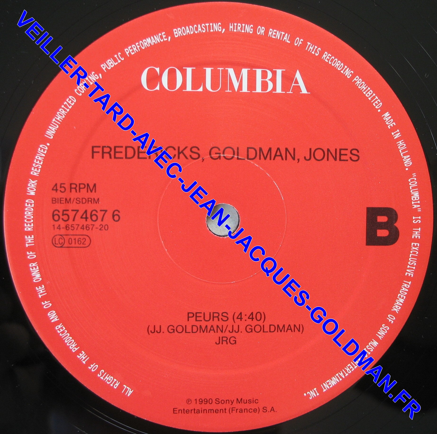 FACE 2 : 45 RPM - BIEM / SDRM - 657467 6 14-657467-20 - LC 0162 / COLUMBIA - FREDERICKS, GOLDMAN, JONES - PEURS - (4:40) (J.J. GOLDMAN / J.J. GOLDMAN) JRG - P 1990 SONY MUSIC ENTERTAINMENT (FRANCE) S.A. / B