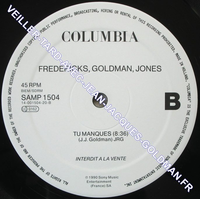 FACE 2 : 45 RPM - BIEM / SDRM - SAMP 1504 14-001504-20- A - LC 0162 / COLUMBIA - FREDERICKS, GOLDMAN, JONES - TU MANQUES - (8:36) (J.J. GOLDMAN) JRG - INTERDIT A LA VENTE - P 1990 SONY MUSIC ENTERTAINMENT (FRANCE) S.A. / B