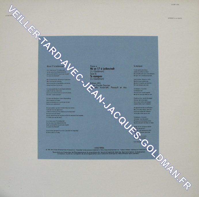 POCHETTE VERSO : 14-001504-20 / SAMP 1504 / INTERDIT A LA VENTE / LC 0162 / NE EN 17 A LEISENSTADT - LES PAROLES / FACE A - NE EN 17 A LEIDENSTADT (J.J. GOLDMAN) - FACE B - TU MANQUES (J.J. GOLDMAN) - EDITION JRG - PHOTO CLAUDE GASSIAN - POCHETTE : ANTONIETTI, PASCAULT & ASS. / TU MANQUES - LES PAROLES / COLUMBIA - C 1991 SONY MUSIC ENTERTAINMENT (FRANCE) S.A. / "COLUMBIA" IS THE EXCLUSIVE TRADEMARK OF SONY MUSIC ENTERTAINMENT INC. / MADE IN HOLLAND / DISTRIBUE EN FRANCE PAR SONY MUSIC. / "TOUS DROITS DU PRODUCTEUR DE PHONOGRAMME ET DU PROPRIETAIRE DE L'OEUVRE ENREGISTREE RESERVES. SAUF AUTORISATION, LA DUPLICATION, LA LOCATION, LE PRET OU L'UTILISATION DE CET ENREGISTREMENT POUR EXECUTION PUBLIQUE OU RADIO DIFFUSION SONT INTERDITS"