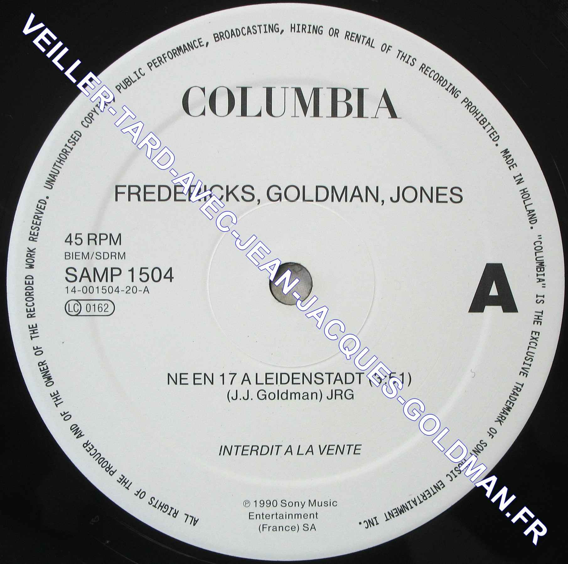 FACE A : 45 RPM - BIEM / SDRM - SAMP 1504 14-001504-20- B - LC 0162 / COLUMBIA - FREDERICKS, GOLDMAN, JONES - NE EN 17 A LEIDENSTADT - (3:51) (J.J. GOLDMAN) JRG - INTERDIT A LA VENTE - P 1990 SONY MUSIC ENTERTAINMENT (FRANCE) S.A. / A