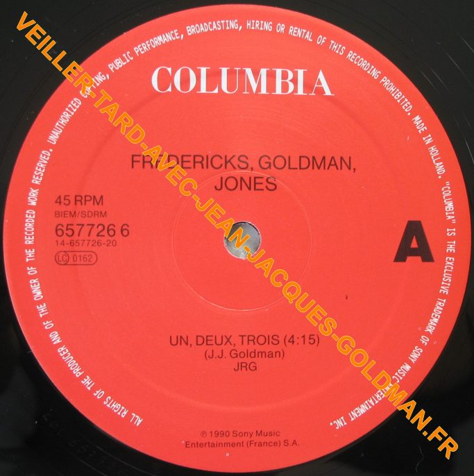 FACE A : 45 RPM - BIEM / SDRM - 657726 6 14-657726-20- LC 0162 / COLUMBIA - FREDERICKS, GOLDMAN, JONES - UN, DEUX, TROIS - (4:15) (J.J. GOLDMAN) JRG - P 1990 SONY MUSIC ENTERTAINMENT (FRANCE) S.A. / A