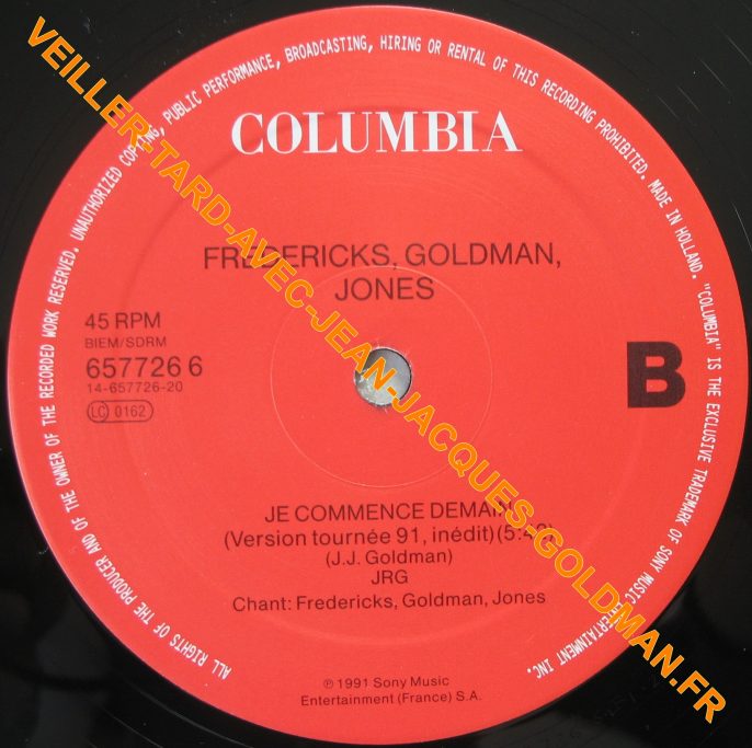 FACE 2 : 45 RPM - BIEM / SDRM - 657726 6 14-657726-20 - LC 0162 / COLUMBIA - FREDERICKS, GOLDMAN, JONES - JE COMMENCE DEMAIN (VERSION TOURNEE 91, INEDIT) - (5:42) (J.J. GOLDMAN) JRG - CHANT : FREDERICKS, GOLDMAN, JONES - P 1991 SONY MUSIC ENTERTAINMENT (FRANCE) S.A. / B