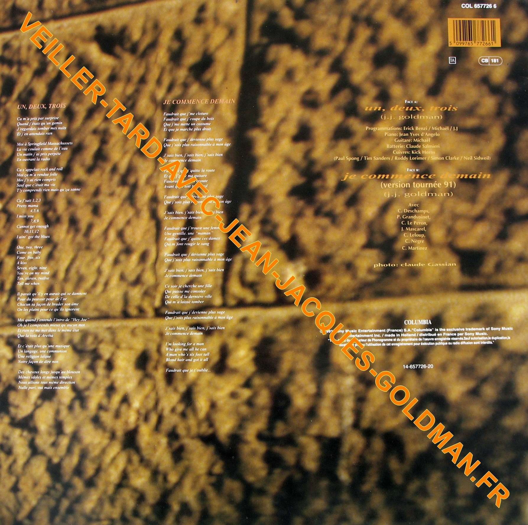 POCHETTE VERSO : UN, DEUX, TROIS - LES PAROLES / JE COMMENCE DEMAIN - LES PAROLES / COL 656726 6 - CODE BARRE 5 099765 772661 - TA - CB 181 / FACE A : UN, DEUX, TROIS (J.J. GOLDMAN) - PROGRAMMATIONS : ERICK BENZI / MICHAEL / JJ - PIANO : JEAN YVES D'ANGELO - GUITARE : MICHAEL - BATTERIE : CLAUDE SALMIERI - CUIVRES : KICK HORNS (PAUL SPONG / TIM SANDERS / RODDY LORIMER / SIMON CLARKE / NEIL SIDWEIL) / FACE B : JE COMMENCE DEMAIN (VERSION TOURNEE 91) (J. J. GOLDMAN) / AVEC : C. DESCHAMPS, P. GRANDVOINET, C. LE PERRON, J. MASCAREL, C. LELOUP, C. NEGRE, C. MARTINEZ - PHOTO : CLAUDE GASSIAN / COLUMBIA / C 1991 SONY MUSIC ENTERTAINMENT (FRANCE) S.A."COLUMBIA" IS THE EXCLUSIVE TRADEMARK OF SONY MUSIC ENTERTAINMENT INC. / MADE IN HOLLAND / DISTRIBUE EN FRANCE PAR SONY MUSIC. "TOUS DROITS DU PRODUCTEUR DE PHONOGRAMME ET DU PROPRIETAIRE DE L'OEUVRE ENREGISTREE RESERVES. SAUF AUTORISATION , LA DUPLICATION, LA LOCATION, LE PRET OU L'UTILISATION DE CET ENREGISTREMENT POUR EXECUTION PUBLIQUE OU RADIO DIFFUSION SONT INTERDITS." / 14-657726-20