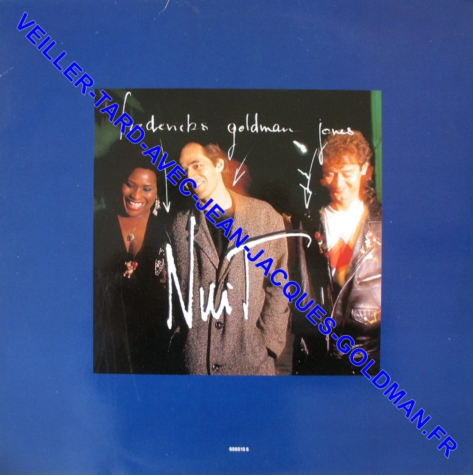 POCHETTE VERSO : PAROLES NUIT - LYRICS REPRODUCED BY KIND PERMISSION OF THE PUBLISHERS. ALL RIGHTS RESERVED - ENGINEER : ANDY SCOTT - PHOTO : CLAUDE GASSIAN / 1 - NUIT - 5:38 - (M. JONES - J.J. GOLDMAN / J.J. GOLDMAN) - 2 - 1 - CHANSONS D'AMOUR (...!) 4:07 ( J. J. GOLDMAN) + 2 - JE L'AIME AUSSI (J. J. GOLDMAN) - PRODUCED BY JEAN-JACQUES GOLDMAN - TAKEN FROM THE FORTHCOMING LP / MC / CD "FREDERICKS GOLDMAN JONES" / 656515 6 - CODE BARRE 5 099765 651560 TA / EPIC - "EPIC" REGISTRED TRADEMARK. EPIC IS THE EXCLUSIVE TRADEMARK OF SONY MUSIC ENTERTAINMENT INC. C 1991 SONY MUSIC ENTERTAINMENT (FRANCE) S.A. DISTRIBUTION SONY MUSIC - WARNING : ALL RIGHTS OF THE PRODUCER AND OF THE OWNER OF THE RECORDED WORK RESERVED. UNAUTHORIZED COPYING, PUBLIC PERFORMANCE, BROADCASTING, HIRING OR RENTAL OF THIS RECORDING PROHIBITED. IN THE UK , APPLY FOR PUBLIC PERFORMANCE LICENCE TO PPL, 14/22 GANTON ST. LONDON W1V 1LB. / 31-656515-20 CB 181