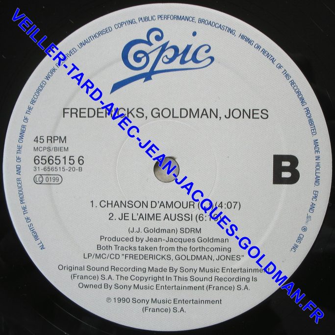 B : 45 RPM - MCPS / BIEM - 656515 6 31-656515-20-B - LC 0199 / EPIC - FREDERICKS, GOLDMAN, JONES - 1 - CHANSON D'AMOUR (...!) (4:07) - 2 - JE L'AIME AUSSI (6:10) (J. J. GOLDMAN) SDRM - PRODUCED BY JEAN-JACQUES GOLDMAN - BOTH TRACKS TAKEN FROM THE FORTHCOMING LP/MC/CD - "FREDERICKS GOLDMAN JONES" / ORIGINAL SOUND RECORDING MADE BY SONY MUSIC ENTERTAINMENT (FRANCE) S.A. - THE COPYRRIGHT IN THIS SOUND RECORDING IS OWNED BY SONY MUSIC ENTERTAINMENT (FRANCE) S.A. / P 1990 SONY MUSIC ENTERTAINMENT (FRANCE) S.A. - B