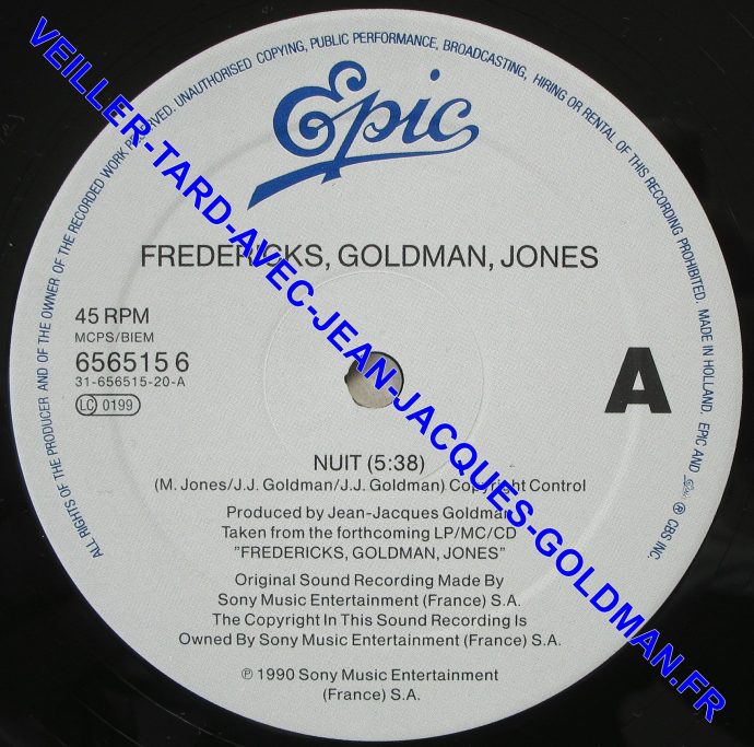 A : 45 RPM - MCPS / BIEM - 656515 6 31-656515-20-A - LC 0199 / EPIC - FREDERICKS, GOLDMAN, JONES - NUIT (5:38) (M. JONES - J.J. GOLDMAN / J.J. GOLDMAN) COPYRIGHT CONTROL - PRODUCED BY JEAN-JACQUES GOLDMAN - TAKEN FROM THE FORTHCOMING LP/MC/CD - "FREDERICKS GOLDMAN JONES" / ORIGINAL SOUND RECORDING MADE BY SONY MUSIC ENTERTAINMENT (FRANCE) S.A. - THE COPYRRIGHT IN THIS SOUND RECORDING IS OWNED BY SONY MUSIC ENTERTAINMENT (FRANCE) S.A. / P 1990 SONY MUSIC ENTERTAINMENT (FRANCE) S.A. - A