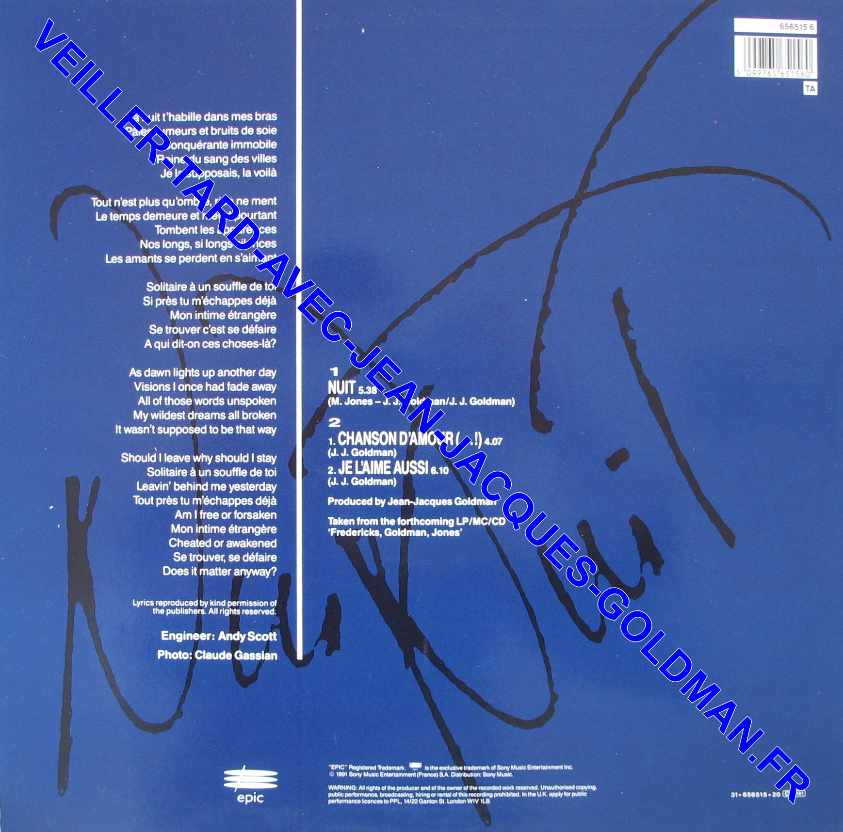 POCHETTE VERSO : PAROLES NUIT - LYRICS REPRODUCED BY KIND PERMISSION OF THE PUBLISHERS. ALL RIGHTS RESERVED - ENGINEER : ANDY SCOTT - PHOTO : CLAUDE GASSIAN / 1 - NUIT - 5:38 - (M. JONES - J.J. GOLDMAN / J.J. GOLDMAN) - 2 - 1 - CHANSONS D'AMOUR (...!) 4:07 ( J. J. GOLDMAN) + 2 - JE L'AIME AUSSI (J. J. GOLDMAN) - PRODUCED BY JEAN-JACQUES GOLDMAN - TAKEN FROM THE FORTHCOMING LP / MC / CD "FREDERICKS GOLDMAN JONES" / 656515 6 - CODE BARRE 5 099765 651560 TA / EPIC - "EPIC" REGISTRED TRADEMARK. EPIC IS THE EXCLUSIVE TRADEMARK OF SONY MUSIC ENTERTAINMENT INC. C 1991 SONY MUSIC ENTERTAINMENT (FRANCE) S.A. DISTRIBUTION SONY MUSIC - WARNING : ALL RIGHTS OF THE PRODUCER AND OF THE OWNER OF THE RECORDED WORK RESERVED. UNAUTHORIZED COPYING, PUBLIC PERFORMANCE, BROADCASTING, HIRING OR RENTAL OF THIS RECORDING PROHIBITED. IN THE UK , APPLY FOR PUBLIC PERFORMANCE LICENCE TO PPL, 14/22 GANTON ST. LONDON W1V 1LB. / 31-656515-20 CB 181
