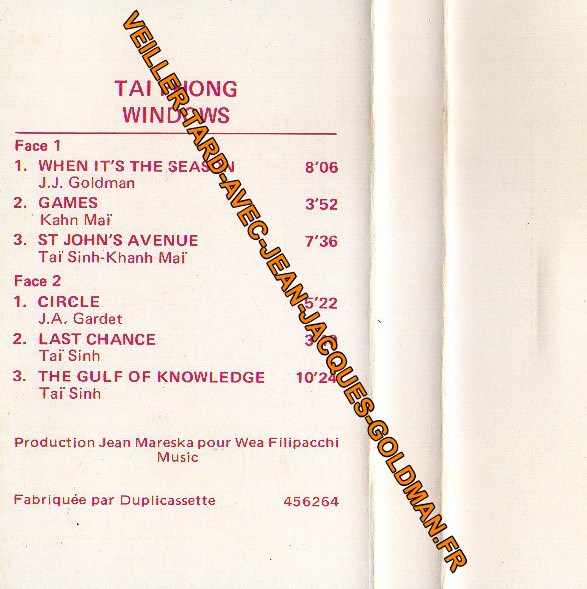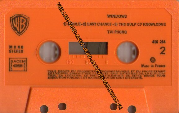 VERSO / ECRITURE ROUGE - TAI PHONG - WINDOWS - FACE 1 / 1 - WHEN IT'S SEASON - J.J. GOLDMAN - 8'06 + 2 - GAMES - KHAN MAÏ - 3'52 + 3 - ST JOHN'S AVENUE - 7'36/ FACE 2 / 1 - CIRCLE - J.A. GARDET - 5'22 + LAST CHANCE - TAÏ SINH - 3'40 + 3 - THE GULF OF KNOWLEDGE - TAÏ SINH - 10'24 / PRODUCTION JEAN MARESKA POUR WEA FILIPACCHI MUSIC / FABRIQUEE PAR DUPLICASSETTE / 456264
