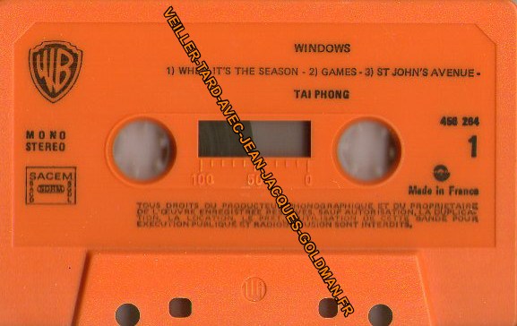 FACE 1 - WB - MONO STEREO - SACEM - SACD - SDRM - SGDL / WINDOWS - 1) WHEN IT'S SEASON - 2) GAMES - 3 ) ST JOHN'S AVENUE - TAÏ PHONG - TOUS DROITS DU PRODUCTEUR PHONOGRAPHIQUE ET DU PROPRIETAIRE DE L'OEUVRE ENREGISTREE RESERVES , SAUF AUTORISATION, LA DUPLICATION, LA LOCATION, LE PRET L'UTILISATION DE CETTE BANDE POUR EXECUTION PUBLIQUE ET RADIODIFFUSION SONT INTERDITS. / 456264 - 1 - LOGO NOIR - MADE IN FRANCE